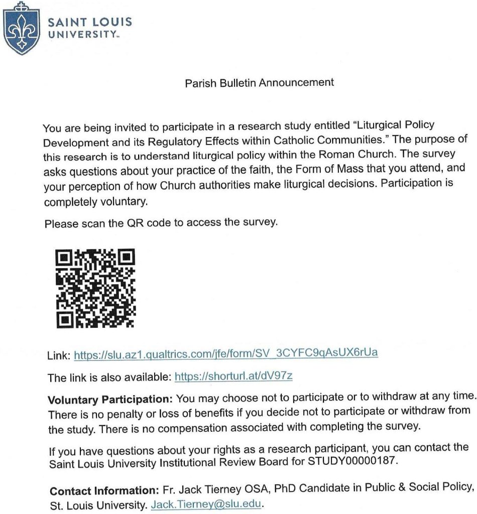 Canon had the mass but the Augustinian did the sermon which was touchy feely typical Novus Ordo content. After some tong in cheek comments on the gospel he cut to the chase. The main purpose of his visit was to tap us for his doctorate thesis which was a survey on “Liturgical Policy Development and its Regulatory Effects within Catholic Communities”. Say that 10 times real fast!
